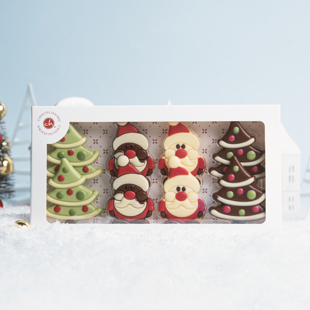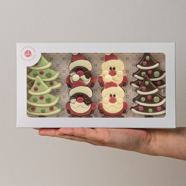 Weihnachten wäre nicht komplett ohne süße Schokoladen-Weihnachtsmänner! Dieses einzigartige Set zaubert festliche Stimmung voller Freude und Schokoladenduft in Ihr Zuhause. Die Figuren bestehen aus einer Mischung aus drei Sorten belgischer Premium-Schokolade – Milch, Weiß und Zartbitter – für einen herrlich harmonischen Geschmack und ein schönes, edles Aussehen.Jedes Set aus Schokoladen-Weihnachtsmännern und -Weihnachtsbäumen wird kurz vor dem Versand von Hand verpackt. Das garantiert maximale Frische, intensives Aroma und eine perfekte Präsentation. Das gesamte Set ist in einer weißen Schachtel mit roten Weihnachtsdekorationen und transparentem Fenster verpackt – elegant und ohne zusätzliche Verpackung.