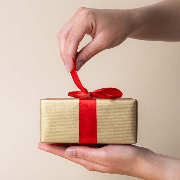 Die in Goldpapier eingewickelte und sorgfältig mit einer roten Schleife verschnürte Schachtel macht einen tollen Eindruck