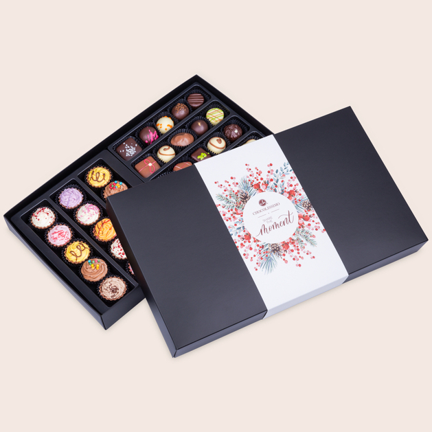 Gönnen Sie sich einen Moment der Schokoladenfreude mit einer vielfältigen Auswahl von Pralinen, verpackt in einer eleganten, schwarzen Schachtel mit einem Band, auf dem "Share the Moment" steht, und einem dekorativen Motiv mit winterlichen Akzenten.