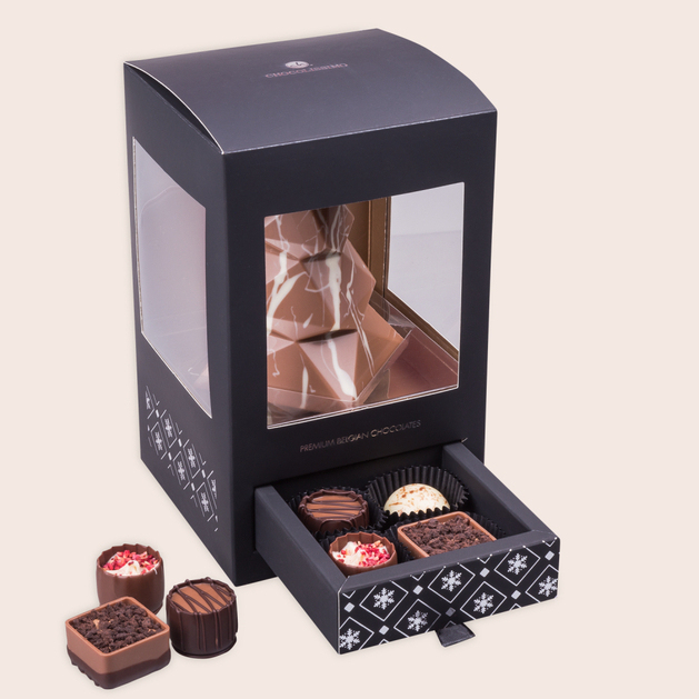 In dieser eleganten schwarzen Schachtel mit silbernen Schneefloken steckt mehr als nur ein Luxus Weihnachtsbaum aus Schokolade 3D! Zu einem Vollmilchschokoladen-Weihnachtsbaum mit Verzierungen aus weißer Schokolade gesellen sich 4 Pralinen, die keinen Alkohol enthalten. Die handgefertigten Pralinen verbergen sich in einem kleinen Schubfach und sorgen als süßes Weihnachtsgeschenk für eine gelungene Überraschung!3D Weihnachtsbaum aus Vollmilchschokolade