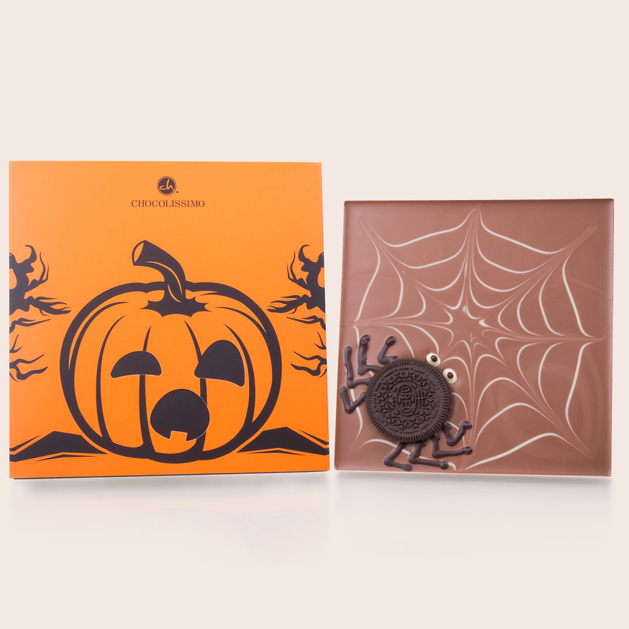 Eine Tafel belgischer Schokolade mit einem Spinnennetz und einem Spinnenkeks ist der perfekte Halloween-Leckerbissen