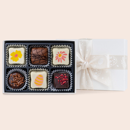 - 4 handgefertigte Pralinen – hergestellt aus belgischer Vollmilch-, weißer und Zartbitterschokolade.