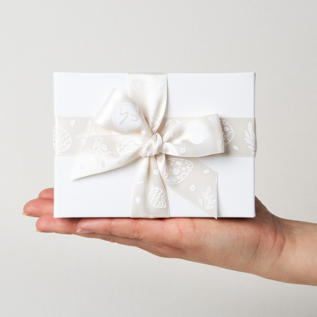 Die Pralinen sind in einer eleganten, weißen Schachtel verpackt, die mit einem weißen Festband gebunden ist, sodass das Geschenk bereit zum Verschenken ist. Dies ist die ideale Wahl für ein Osterpräsent, sowohl für die Familie als auch für Kollegen.