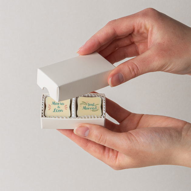 - Einzigartiges, personalisiertes Gastgeschenk – Oxide Duo-Pralinen mit Aufdruck, abgestimmt auf den Stil der Hochzeit