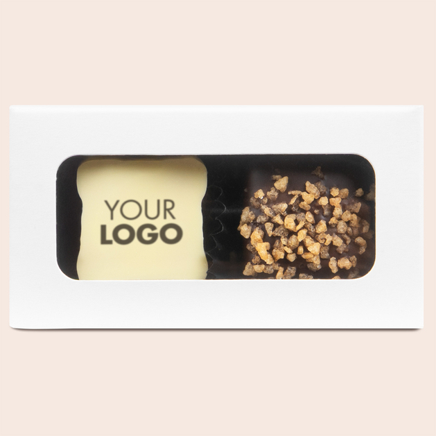 Schenken Sie Ihren Kunden oder Geschäftspartnern mehr als nur Süßigkeiten – präsentieren Sie Ihre Marke auf elegante und einprägsame Weise. Dieses Set aus zwei Pralinen vereint handwerkliche Herstellung, belgische Premium-Schokolade und Personalisierungsmöglichkeiten, mit denen Sie eine Botschaft kreieren können, die perfekt zu Ihren Geschäftszielen passt.Jede Praline wird in unserer Chocolissimo-Manufaktur von Hand hergestellt – mit Liebe zum Detail, Frische und Qualität. Samtige weiße Schokolade, eine zarte Füllung und ein essbarer Aufdruck mit Ihrem Logo, Ihrer Grafik oder Ihrem QR-Code sind das Rezept für einen einheitlichen, modernen und effektiven Träger Ihres Markenimages.