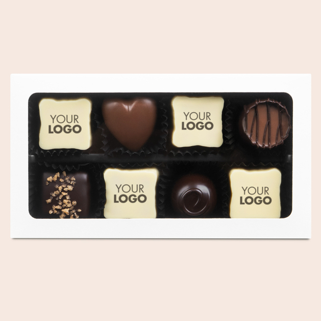 Beeindrucken Sie Ihre Kunden und Geschäftspartner mit einem einzigartigen Geschenk, das Geschmack, Ästhetik und effektive Kommunikation vereint. Das Set aus acht handgefertigten Pralinen mit Aufdruck ist die perfekte Wahl, wenn es auf Qualität, Details und die Übereinstimmung mit dem Markenimage ankommt.In der Verpackung finden Sie acht handgefertigte Pralinen in einer Verpackung mit Sichtfenster, darunter vier Pralinen mit essbarem Aufdruck, den Sie nach Belieben personalisieren können – mit Ihrem Logo, einer Grafik, einem QR-Code oder einem Slogan. Die übrigen Pralinen ergänzen das Set mit exquisiten Füllungen und klassischer Form. Alles wird in der Chocolissimo-Manufaktur von Hand aus belgischer Schokolade höchster Qualität hergestellt.