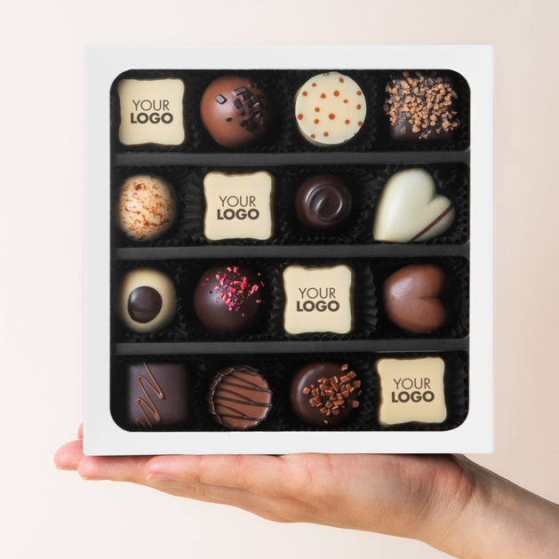 Sind Sie auf der Suche nach einem Geschenk, das einen bleibenden Eindruck hinterlässt und gleichzeitig zum Image Ihrer Marke passt? Ein Set aus sechzehn handgefertigten Pralinen mit Aufdruck ist ein Angebot, das Eleganz, Qualität und effektives Branding in einer ästhetischen Schachtel vereint.Im Inneren finden Sie sechzehn handgefertigte Pralinen in einer Verpackung mit Sichtfenster, von denen vier Pralinen mit einem essbaren Aufdruck verziert sind – hier ist Platz für Ihr Logo, Ihre Grafik oder Ihren Slogan. Die übrigen Pralinen ergänzen das Ganze mit Premium-Aromen und bilden ein durchdachtes, stimmiges Set, das sich ideal für wichtige geschäftliche Anlässe eignet.