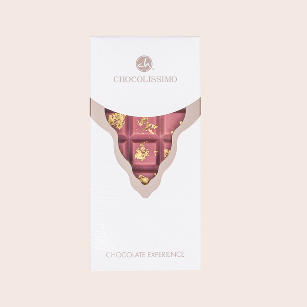 Die schmelzende Tafel echter, natürlicher Ruby-Schokolade wird selbst die anspruchsvollsten Genussträger verzaubern. Der Luxus dieser Süßigkeit wird durch die handwerkliche Herstellung und die kunstvolle Verzierung mit goldenen Flocken noch verstärkt. Dies ist das perfekte Geschenk oder eine exquisite Ergänzung zu einem größeren Präsent – sowohl für sie als auch für ihn, für jede Gelegenheit.