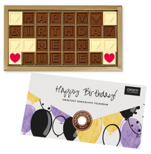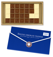 Verschenken Sie zur Konfirmation ganz besondere Glückwünsche: Die individuelle Schokoladennachricht ist in einer eleganten Holzbox verpackt und besteht aus 48 Schokoladensteinen aus Vollmilch- und weißer Schokolade.