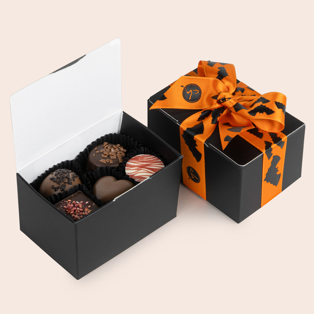 Belgische Schokoladenpralinen in dekorativer Verpackung fangen die Halloween-Atmosphäre perfekt ein