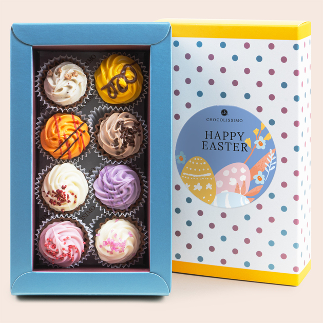 Bringen Sie österliche Freude und süße Eleganz in Ihre Feiertage mit dem Set aus 8 Oster-Cupcakes in schokoladiger Variante. Dieses besondere Pralinen-Set in Form amerikanischer Cupcakes begeistert nicht nur mit seinem raffinierten Geschmack, sondern auch mit einer fröhlichen, bunten Verpackung, die von Ostern inspiriert ist. Jeder Cupcake ist ein kleines handgefertigtes Kunstwerk aus hochwertiger belgischer Schokolade und mit einer köstlichen, sorgfältig ausgewählten Füllung versehen.