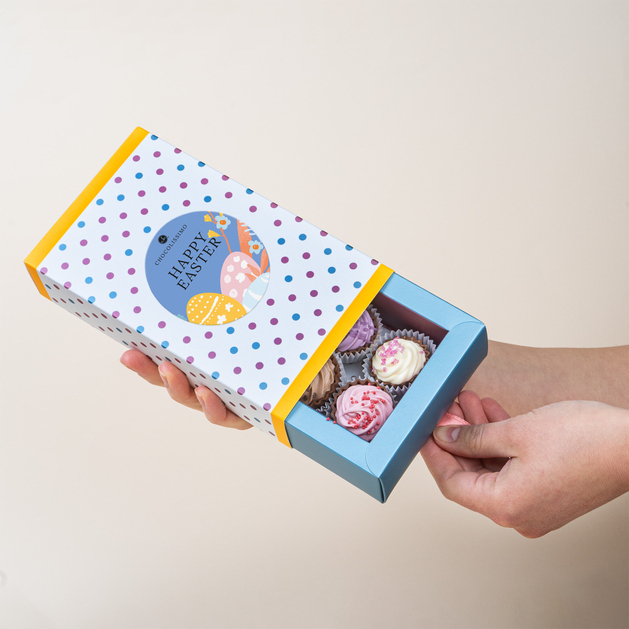Pralinen in Form süßer amerikanischer Cupcakes verbinden ausgezeichneten Geschmack mit origineller Form in österlicher Ausführung. Jede Praline begeistert durch präzise nachgebildete Cupcake-Form, während die österliche Verpackung ihren fröhlichen, frühlingshaften Charakter unterstreicht. Kleine Kunstwerke aus Schokolade, die nicht nur den Gaumen, sondern auch das Auge erfreuen und jedes Geschenk zu etwas Besonderem und Charmantem machen.