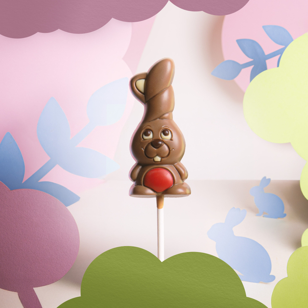 Der Osterhase-Lollipop aus feinster belgischer Schokolade vereint cremige Milchschokolade mit Dekorationen aus Zartbitter-, weißer und eingefärbter Schokolade. So entsteht ein harmonisches Ganzes, das durch intensive Aromen und reichhaltigen Geschmack begeistert.