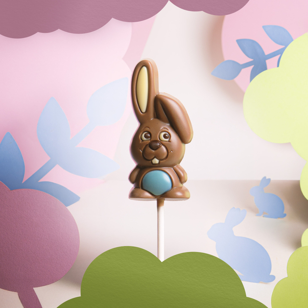 Der Osterhase-Lollipop aus feinster belgischer Schokolade vereint cremige Milchschokolade mit Dekorationen aus Zartbitter-, weißer und eingefärbter Schokolade. So entsteht ein harmonisches Ganzes, das durch intensive Aromen und reichhaltigen Geschmack begeistert.