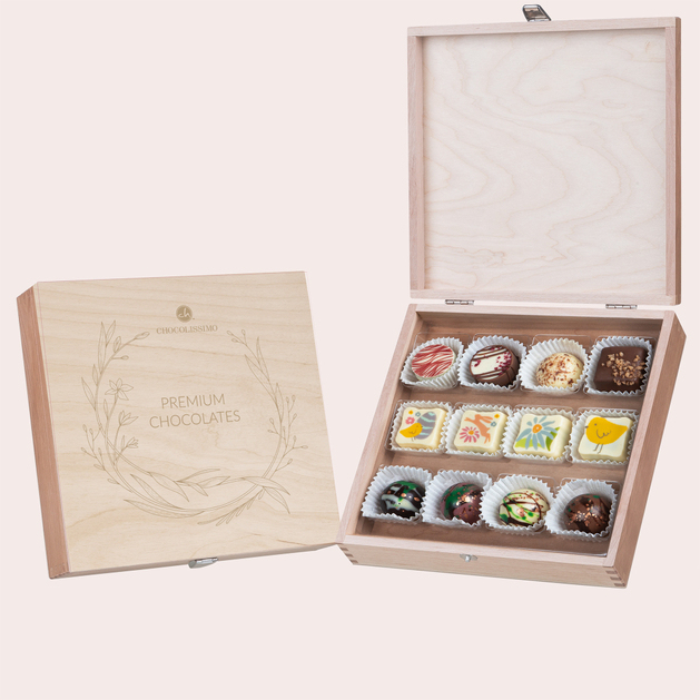 Schenken Sie Ihren Liebsten ein Ostergeschenk, das Vielfalt an Geschmack, handwerkliche Qualität und elegante Präsentation vereint. In dem sorgfältig gefertigten Holzkästchen mit Verschluss befinden sich 12 handgefertigte Pralinen, die in der Chocolissimo-Werkstatt von erfahrenen Chocolatiers direkt vor dem Versand hergestellt werden. Für ihre Herstellung wird ausschließlich hochwertige belgische Schokolade verwendet, die maximale Frische, samtige Konsistenz und ausgezeichneten Geschmack garantiert.