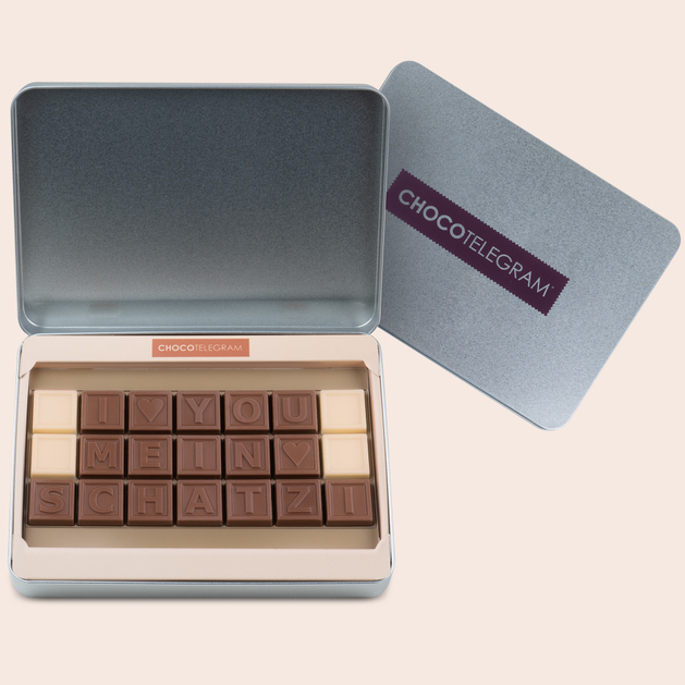 Der ChocoTelegram „I LOVE YOU MEIN SCHATZI” ist die perfekte Art, Ihre Liebe auf eine süße und unvergessliche Weise auszudrücken. Mit 21 Schokoladenbuchstaben aus feinster Vollmilchschokolade und einer edlen Verpackung wird Ihre Liebesbotschaft garantiert Herzen erobern.