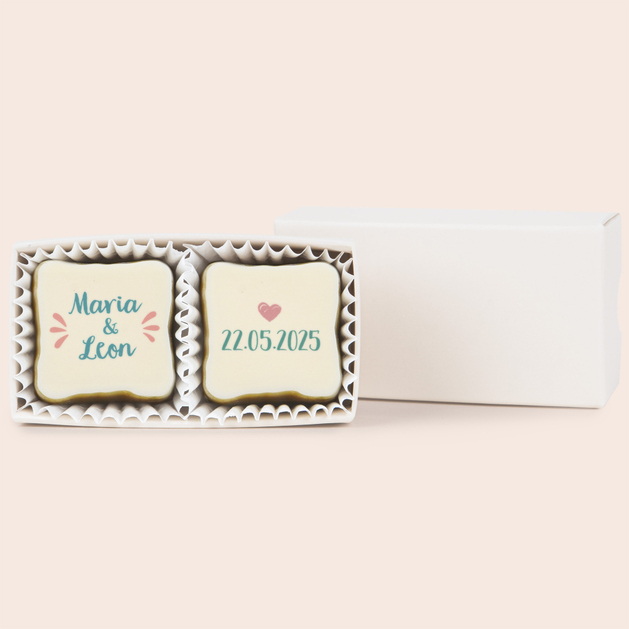 - Einzigartiges, personalisiertes Gastgeschenk – Oxide Duo-Pralinen mit Aufdruck, abgestimmt auf den Stil der Hochzeit