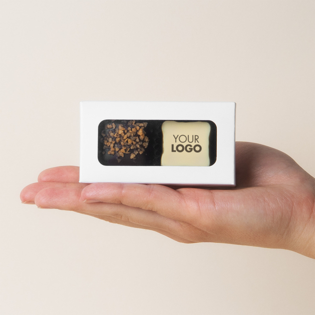 Schenken Sie Ihren Kunden oder Geschäftspartnern mehr als nur Süßigkeiten – präsentieren Sie Ihre Marke auf elegante und einprägsame Weise. Dieses Set aus zwei Pralinen vereint handwerkliche Herstellung, belgische Premium-Schokolade und Personalisierungsmöglichkeiten, mit denen Sie eine Botschaft kreieren können, die perfekt zu Ihren Geschäftszielen passt.Jede Praline wird in unserer Chocolissimo-Manufaktur von Hand hergestellt – mit Liebe zum Detail, Frische und Qualität. Samtige weiße Schokolade, eine zarte Füllung und ein essbarer Aufdruck mit Ihrem Logo, Ihrer Grafik oder Ihrem QR-Code sind das Rezept für einen einheitlichen, modernen und effektiven Träger Ihres Markenimages.