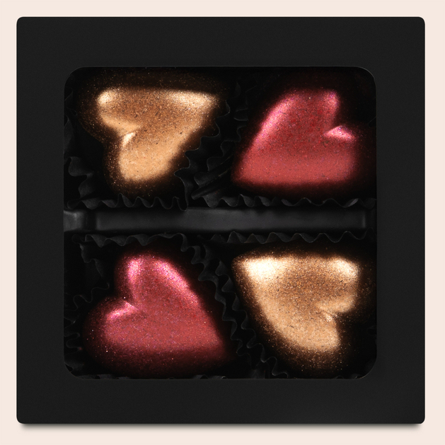 Diese besonderen 4 Herzpralinen mit Karamell sind die perfekte Art, Gefühle auf elegante und sinnliche Weise auszudrücken. Handgefertigt in der Chocolissimo-Manufaktur aus hochwertiger belgischer Schokolade, überzeugen sie nicht nur durch ihren Geschmack, sondern auch durch ihr Aussehen. Die glänzende Oberfläche in Gold- und Tiefrot-Tönen macht jede Praline zu einem kleinen Kunstwerk, das für besondere Anlässe geschaffen wurde.