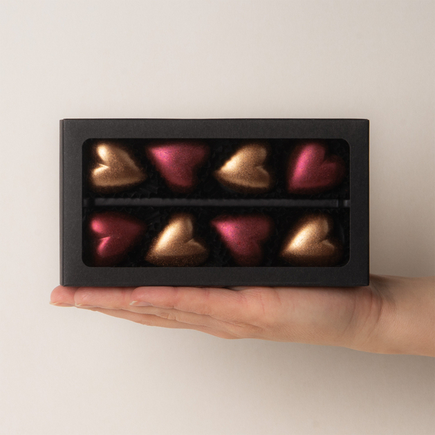 Die Herzpralinen werden in der Chocolissimo-Manufaktur von Hand gefertigt, unter Aufsicht erfahrener Chocolatiers, die auf jedes Detail achten. Die glänzende, metallische Oberfläche verleiht ihnen ein luxuriöses Aussehen, zieht alle Blicke auf sich und begeistert bereits auf den ersten Blick mit Eleganz – so werden sie zu einem eindrucksvollen und einzigartigen Geschenk.