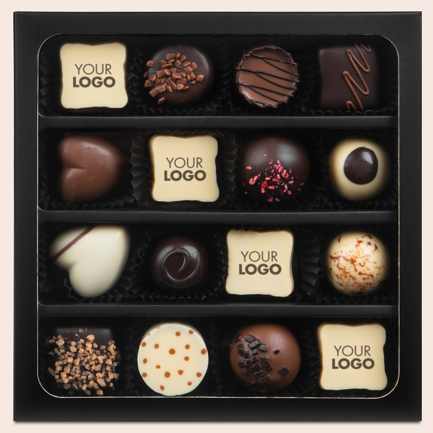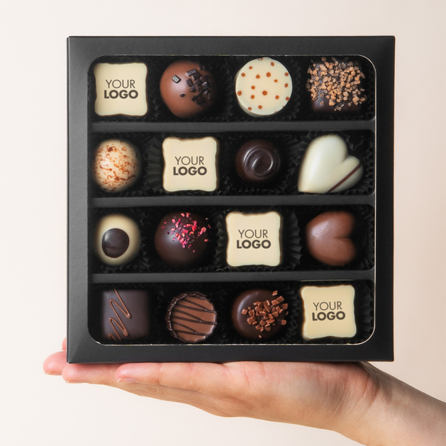 Sind Sie auf der Suche nach einem Geschenk, das einen bleibenden Eindruck hinterlässt und gleichzeitig zum Image Ihrer Marke passt? Ein Set aus sechzehn handgefertigten Pralinen mit Aufdruck ist ein Angebot, das Eleganz, Qualität und effektives Branding in einer ästhetischen Schachtel vereint.Im Inneren finden Sie sechzehn handgefertigte Pralinen in einer Verpackung mit Sichtfenster, von denen vier Pralinen mit einem essbaren Aufdruck verziert sind – hier ist Platz für Ihr Logo, Ihre Grafik oder Ihren Slogan. Die übrigen Pralinen ergänzen das Ganze mit Premium-Aromen und bilden ein durchdachtes, stimmiges Set, das sich ideal für wichtige geschäftliche Anlässe eignet.