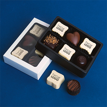 Überraschen Sie Ihre Kunden, Geschäftspartner oder Veranstaltungsteilnehmer mit einem eleganten und zugleich personalisierten Geschenk. Das Set aus sechs handgefertigten Pralinen mit Aufdruck vereint höchste Qualität, ausdrucksstarkes Branding und eine Form, die schon beim Überreichen für einen Wow-Effekt sorgt.Das Set enthält sechs handgefertigte Pralinen in einer Verpackung mit Sichtfenster, von denen drei mit einem essbaren Aufdruck mit Ihrem Logo, einer Grafik oder einem QR-Code verziert sind, während die übrigen die Komposition mit dem Geschmack und der Ästhetik klassischer Pralinen ergänzen. Alle werden in unserer Chocolissimo-Manufaktur von Hand hergestellt – mit Liebe zum Detail, Frische und höchster Qualität der Zutaten.