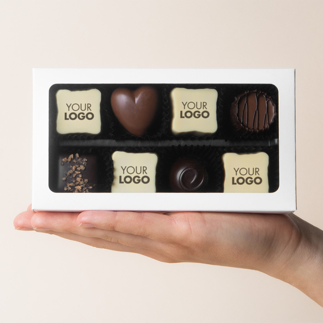 Beeindrucken Sie Ihre Kunden und Geschäftspartner mit einem einzigartigen Geschenk, das Geschmack, Ästhetik und effektive Kommunikation vereint. Das Set aus acht handgefertigten Pralinen mit Aufdruck ist die perfekte Wahl, wenn es auf Qualität, Details und die Übereinstimmung mit dem Markenimage ankommt.In der Verpackung finden Sie acht handgefertigte Pralinen in einer Verpackung mit Sichtfenster, darunter vier Pralinen mit essbarem Aufdruck, den Sie nach Belieben personalisieren können – mit Ihrem Logo, einer Grafik, einem QR-Code oder einem Slogan. Die übrigen Pralinen ergänzen das Set mit exquisiten Füllungen und klassischer Form. Alles wird in der Chocolissimo-Manufaktur von Hand aus belgischer Schokolade höchster Qualität hergestellt.