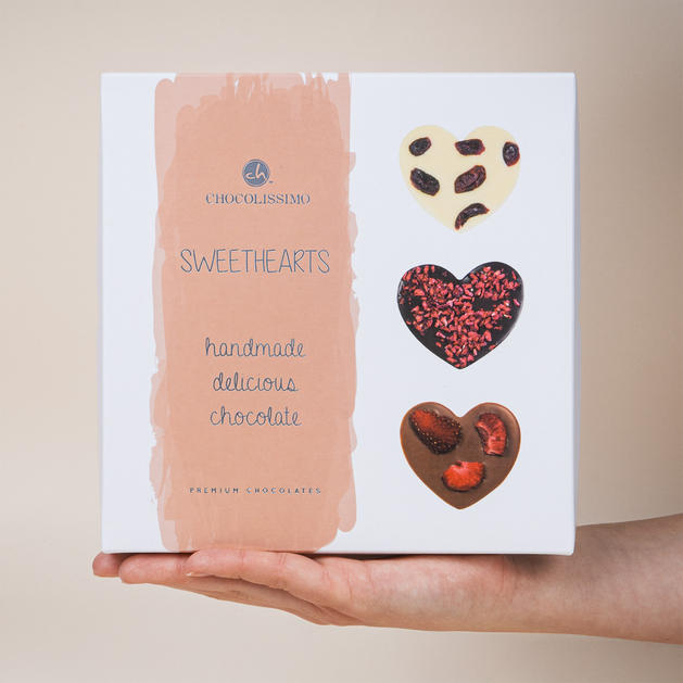 Samtig-zarte weiße Schokolade mit Cranberries, feine Milchschokolade mit Erdbeeren und intensive dunkle Schokolade mit Himbeeren – jede dieser exquisiten Geschmackskombinationen ist in handgefertigten Schokoladenherzen von Chocolissimo eingeschlossen.