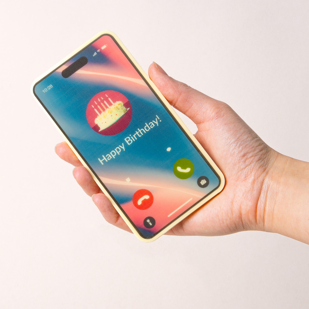 Der essbare Aufdruck auf dem Schokoladen-Smartphone ähnelt täuschend echt einem richtigen Handybildschirm und zeigt außergewöhnliche Geburtstagswünsche. Dieses realistische Detail macht das süße Smartphone zu einem originellen und eindrucksvollen Geschenk, das auf moderne Weise Aufmerksamkeit zeigt und der beschenkten Person Freude bereitet.