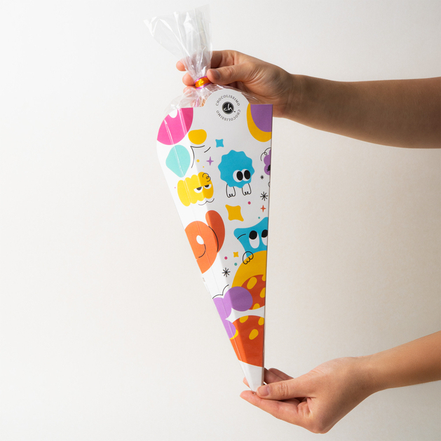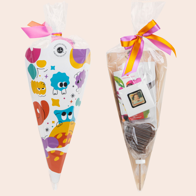Die Schultüte ist eine transparente Tüte aus schönem Geschenkpapier, die mit einem dezenten Band zusammengebunden ist, wodurch die Süßigkeiten besonders gut zur Geltung kommen. Auf der Rückseite befindet sich ein Karton mit einer farbenfrohen, originellen Grafik, sodass das Geschenk ohne zusätzliche Verpackung verschenkt werden kann.