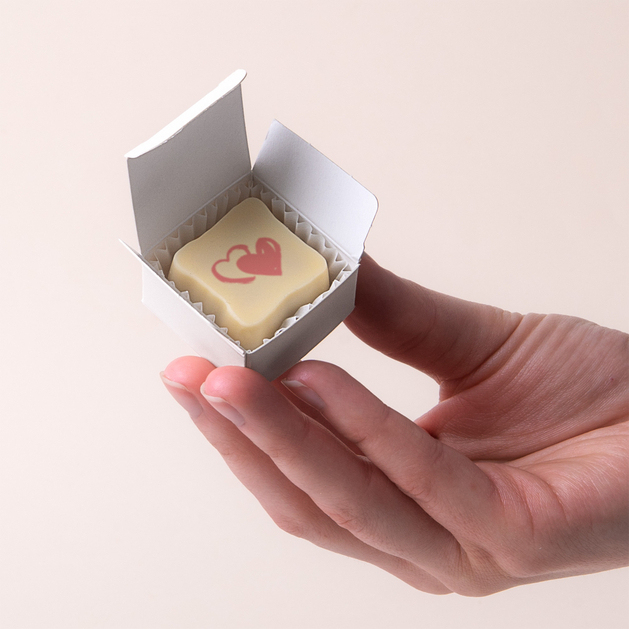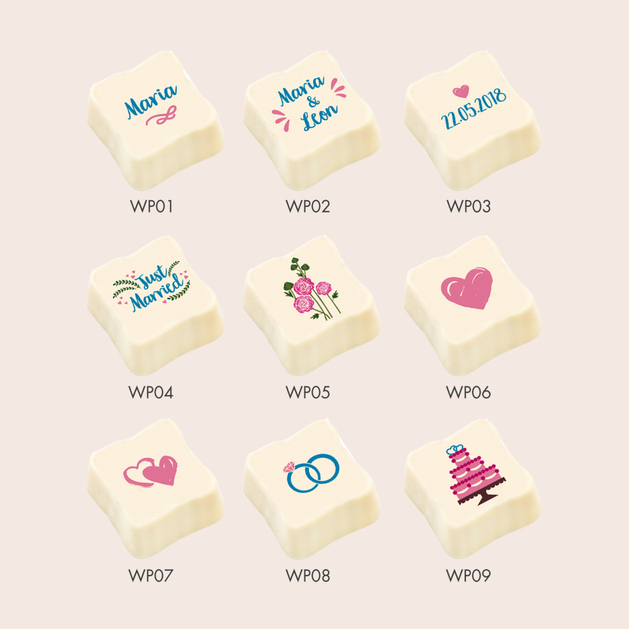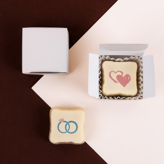 Die Möglichkeit, einen individuellen Aufdruck auf der Praline zu wählen, macht sie zu einer hervorragenden Idee zur Dekoration des Tisches bei feierlichen Verlobungs-, Hochzeits- oder Jubiläumsfeiern. Die Praline eignet sich außerdem ideal als Dankeschön für Hochzeitsgäste. Jede Praline ist in einer eleganten weißen Schachtel verpackt.