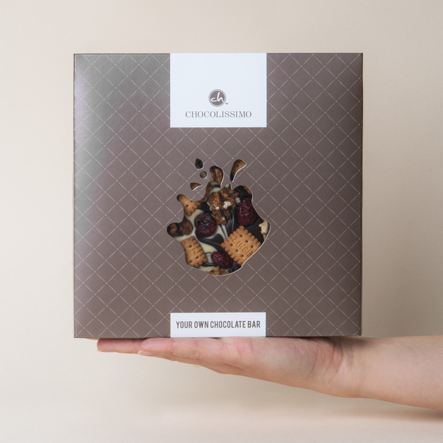 - Elegante Geschenkverpackung – ein brauner Karton mit Sichtfenster präsentiert die Schokolade und eignet sich zum Verschenken ohne zusätzliche Verpackung.