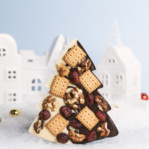 Getrocknete Cranberries, knackige Walnüsse und goldgelbe Keksstücke verleihen diesem Schokoladen-Weihnachtsbaum seinen einzigartigen Charakter. Die Säure der Cranberries gleicht die Süße der Schokolade aus, die Nüsse sorgen für eine feine Note und die Kekse für ein angenehmes Knuspern. Diese harmonische Mischung aus Aromen und Texturen macht jede Portion des Weihnachtsbaums zu einem kleinen, festlichen Leckerbissen.